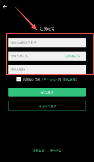1、注册时先输入邮箱或手机号点击获取验证码填写密码并勾选用户协议最后提交即可完成。