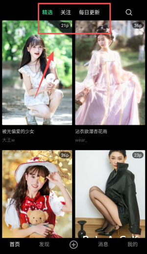 3、首页精选内容每日更新可浏览关注作品图片数量会显示在右下角方便选择。