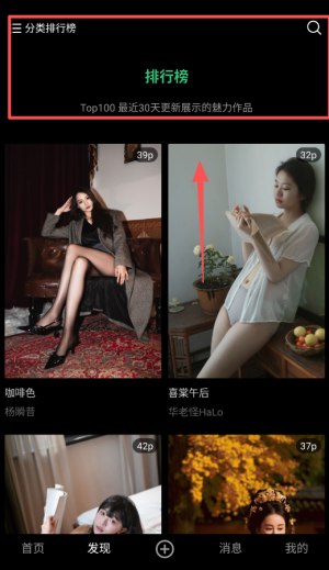 4、在发现页可查看分类排行榜如Top100作品按更新时间展示便于发现热门内容。