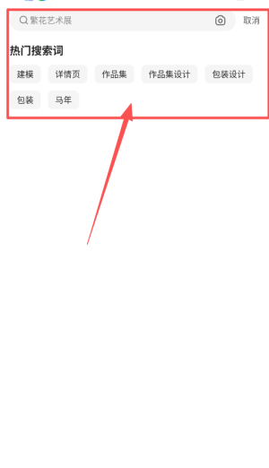1、在首页搜索框输入关键词,如建模、包装设计,可查看热门搜索词或直接搜索艺术展、作品集等内容。