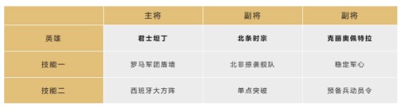 君坦搭配的技能主要就是嘲讽敌方武将(瑞士卫队可以替换,但容易被沉默,而罗马军盾是被动技能不会被沉默)并降低伤害。