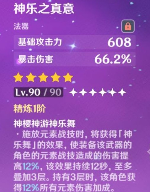 施放元素战技时,将获得「神乐舞」的效果,使装备该武器的角色的元素战技造成的伤害提高12%,该效果持续12秒,至多叠加3层。持有3层时,该角色获得12%所有元素伤害加成。