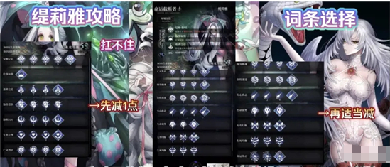 我们马上进入到boss的词条选择,因为我们挑战缇莉雅选的是挂机流,所以up建议:除了流蚀骨恐惧只加一点,和生死均衡不加点,其他全部拉满即可。