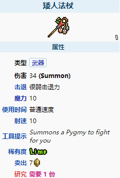 矮人法杖是一件困难模式召唤武器。它能召唤跟随玩家且以矛远程攻击敌人的矮人。
