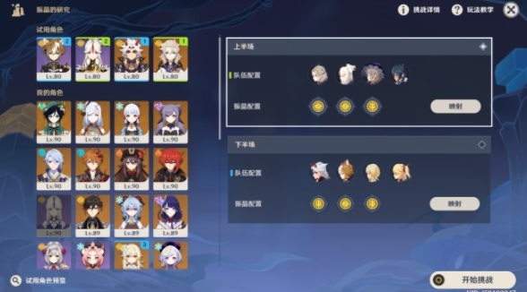 上半场:选择阿贝多、凝光、以及两个挂元素的角色(可以使用除岩系以外的元素攻击角色)