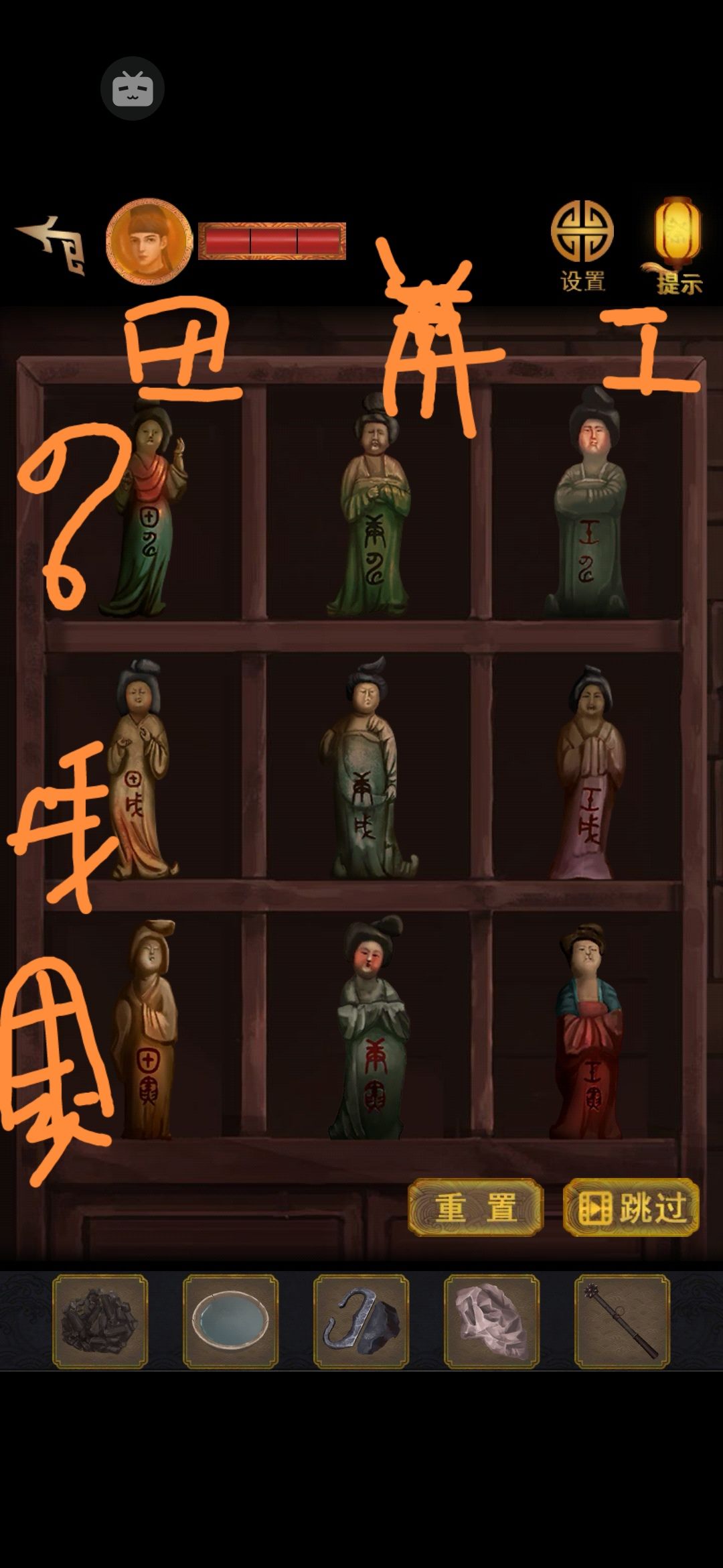 11.把陶俑放旁边柜子上,发现陶俑身上写了字,字好像跟刚才手上的纸条有点关系。按纸条拖动陶俑摆好。下面柜门打开,解药出柜咯。原来这容易有人误食断肠草,难怪家中常备健胃消bushi三黄药。