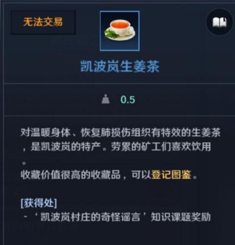 1、凯波岚生姜茶知识如下图所示,这个需要在凯波岚村庄完成奇怪的谣言知识课题获取,其实是一个支线任务的奖励;