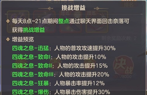 其次是尽量拿好增益BUFF再打,可以在每日8-21点,整点期间,通过聊天频道回应奈落对话,获得短暂的挑战奈落增益效果。