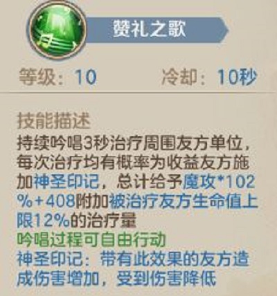 1、一技能选择赞礼之歌可以在3秒内持续治疗走周围目标以及自身,在持续吟唱时可以有概率给治疗目标添加神圣印记(有此印记的友方单位伤害贼高,受到伤害减少,最高可以叠加五层)对应的被动技能只是增加此技能的治疗量,且只针对该技能,对整体治疗量没有加成。