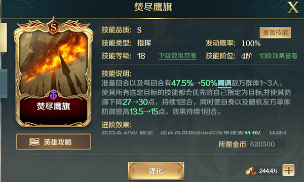 主要的输出技能,圆桌武士每回合稳定对敌方两个随机单位进行单体高额伤害,且在命中嘲讽状态目标时高概率为我方副将施加抵御效果。