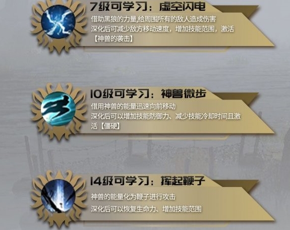 神兽微步:借助神兽的能量迅速向前移动,打击伤害110%,技能使用中超级盔甲。最大使用次数1,冷却时间8秒。