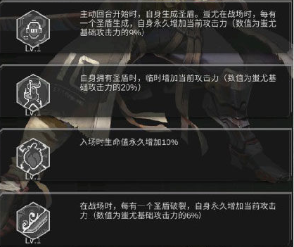 蚩尤技能概括:蚩尤的技能是场上有圣盾生成或破裂都会令其增加攻击力,无论在不在场都可以进行圣盾累计。如果圣盾叠加够多,可以一次性收割。