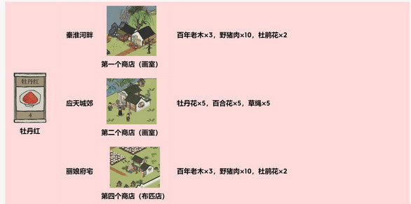 颜料名称 获取地点 所需物品 牡丹红 秦淮河畔的第一个商店(画室) 百年老木3个,野猪肉10个,杜鹃花2个 应天城郊第二个商店(画室) 牡丹花5个,百合花5个,草绳5个 丽娘府宅第四个商店(布匹店) 百年老木3个,野猪肉10个,杜鹃花2个 杏仁黄 秦淮河畔第二个商店(造纸张) 金花笺3个,皂荚10个,铁矿石5个 飞泉绿 应天城郊第二个商店(画室) 牡丹花5个,竹叶5个,百合花5个 丽娘府宅第二个商店(早餐摊) 松果3个,梨花3个 松烟墨 应天城郊第二个商店(画室) 牡丹花5个,松果7个 丽娘府宅第一个商店(书院) 牡丹花5个,松果7个 晴山蓝 丽娘府宅第二个商店(早餐摊) 松果5个,牡丹花5个 青花蓝 丽娘府宅第三个商店(瓷器店) 花瓶1个,草绳7个 (Tips:金花笺获取需要原料纸3个,野草15个,杜鹃花9个;花瓶获取需要杜鹃花5个,草绳4个。)