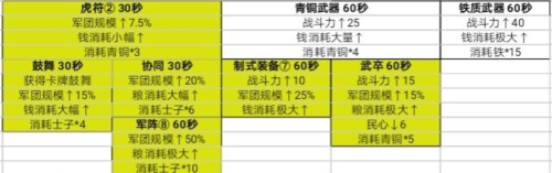 对比现有版本的[提升战斗力的政策]与[提升军队规模的政策],相同加成比例下,明显[提升军队规模的的政策]所需要的钱粮消耗比前者小很多!