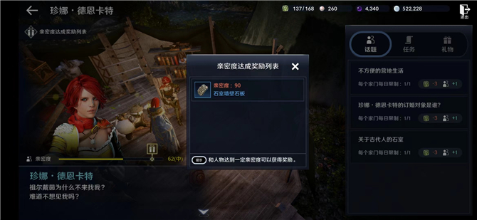 2、当我们的亲密度到达90点,即可获得石室墙壁石板奖励,多做做亲密度任务就行了。