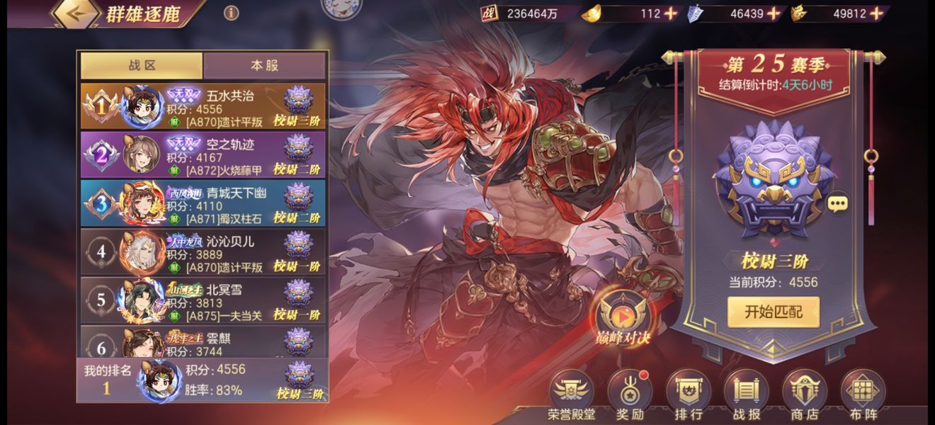 测试了二三百吧,新魏盾在我的梯队上分最舒服,今日目前可达到战区38名,4350分。号的硬件有点低,带不了蔡文姬,前排扛不住只能打普通水平同站灭比