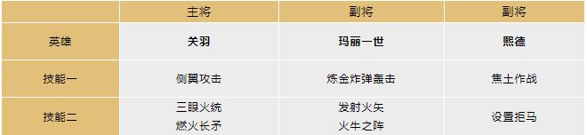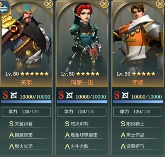初阶灼烧队是游戏初期较为容易组合的开荒阵容,核心自然是不难获得的关羽,而与其搭配的也是非常易得的玛丽一世和熙德。熙德是初始可选的英雄之一,而玛丽一世则在前期完成任务后就能免费获得。这个简单易上手的灼烧组合性能也并不弱,三个英雄本身具有的命运之网效果可以直接为敌方主将施加灼烧状态,并且在灼烧后还有几率施加缴械效果,可以说完美地适配关羽的技能,能让其有更好的机会打出高额爆发。