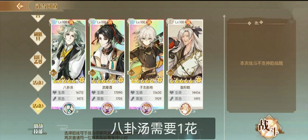 1、需要1花八卦汤一只,0花会比较赌,搭配担仔面3回合也能赌过去,需要卡叫花鸡cd,先秒叫花鸡,其它位置开花随意,当然输出越高越好。
