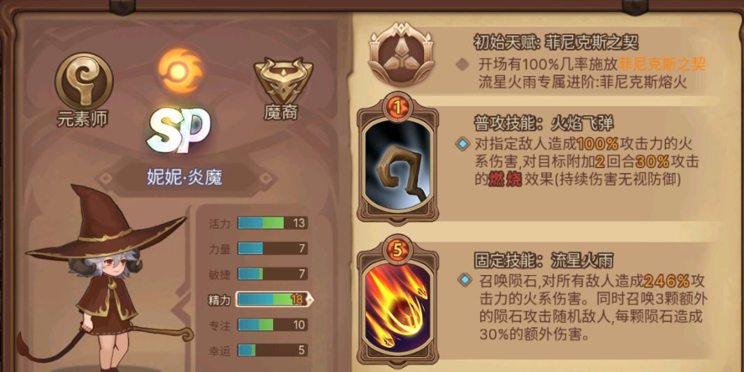 全体友军附加魔神随从印记:火系伤害+30%,暴击率+10%,每次释放火系技能将为妮妮回馈1只火灵,战斗开始获得3只火灵;