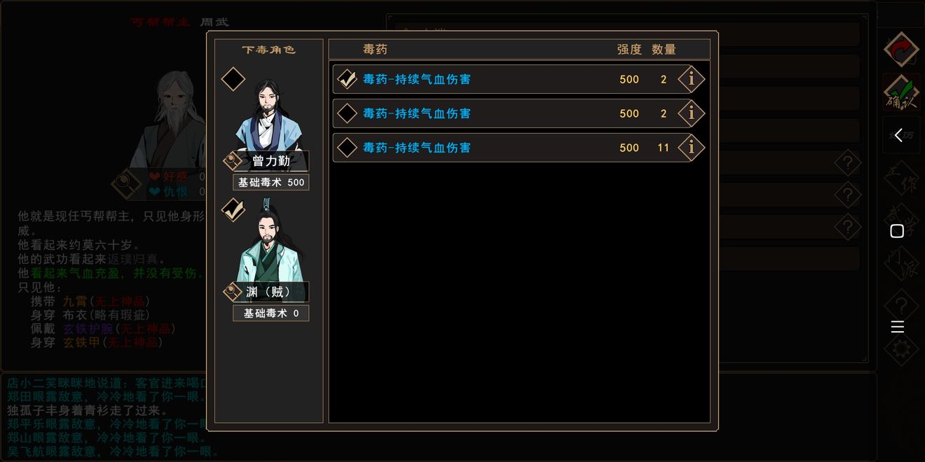 带好毒药,找到咱要迫害的NPC,我本就是个咸鱼,也特别懒就找丐帮帮主给大家演示了。申时5刻咱开始下毒。