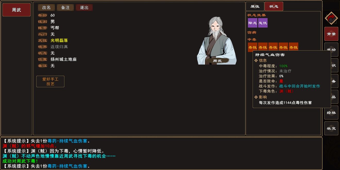 经过一段时间的研究我发现毒药,分为致命毒和负面毒,负面毒只会加buff,致命毒叠到100后就会在下一次发作直接暴毙,要是咱没钱只能给NPC下一瓶毒致命,