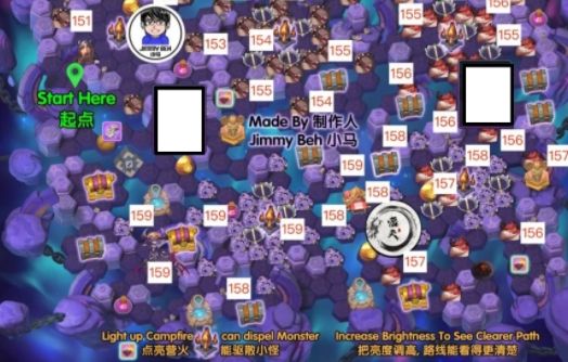 2、前往3号位置,途经资源拿下,攻打3号位置的153级小怪,按照地图走到4号位置(不打小怪),然后点火点亮地图,驱除周围小怪,此时身上火种数量为0。