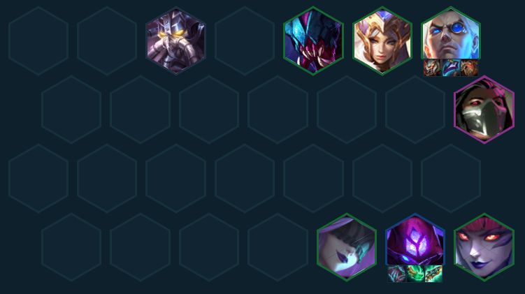 阵容组成:卡萨丁(1)、雷克塞(2)、瑟庄妮(2)、斯维因(2)、烈娜塔(4)、辛德拉(2)、玛尔扎哈(3)、婕拉(2)