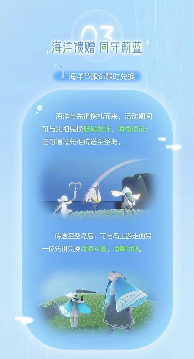 活动期间,可以在遇境的海洋先祖兑换珊瑚发饰和海龟项链。可以从遇境海洋节先祖传送到圣岛。可以跟圣岛的海洋节先祖兑换海螺项链和海浪斗篷。海龟斗篷同步上线,在商店购买,真金白银。