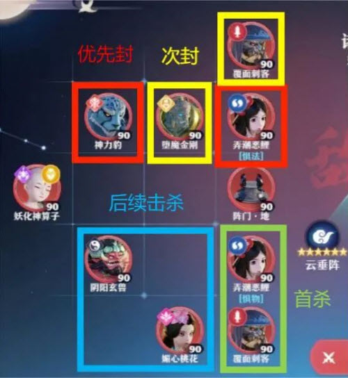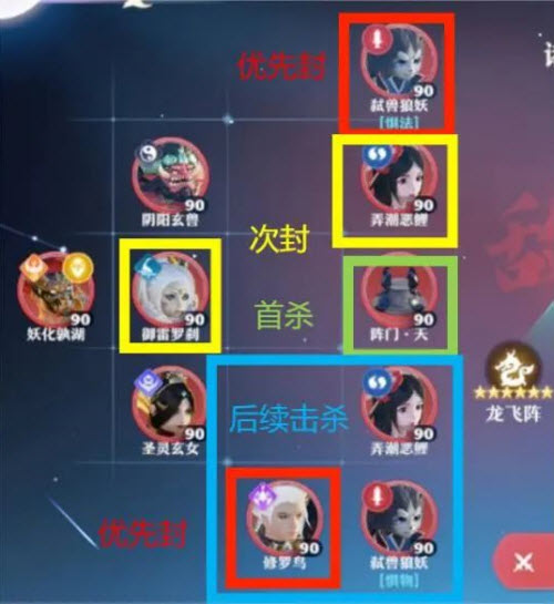 第一回合,封万毒和惧法狼妖(狼妖会优先点杀灵兽,合欢记得红封),奶辅喝酒,集火阵门(伤害溢出的话记得分点灵兽去打悍牛)。
