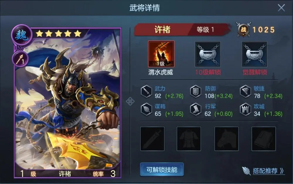 核心输出——许褚,技能推荐:短兵相见+轻勇飞燕