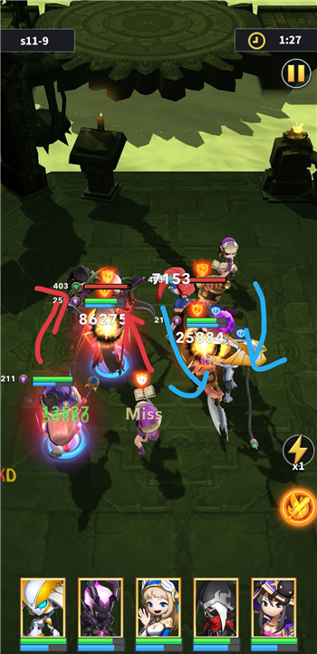 说一下我暂时从左到右来称呼我方阵容相对应的位置,我们来一倍速看看推图实际的攻击第一仇恨目标。