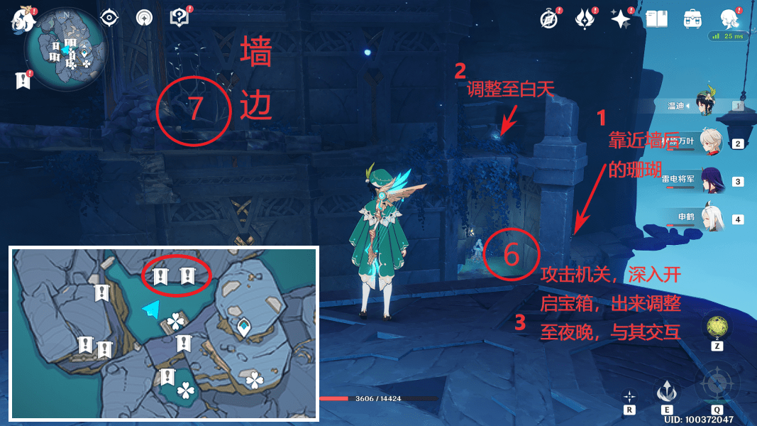 6号,先在夜晚模式使用珊瑚,调整至白天,进入攻击机关,顺手开个宝箱