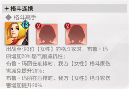 虽然理论上三位格斗家就可以激活连携,但是她的技能的buff是能给到全队的,所以纯妹妹队能够最大化的吃到玛丽格斗连携的效果加成。