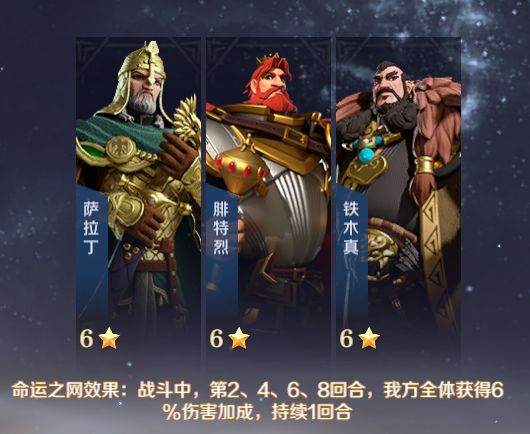 萨拉丁自身就带有连击效果,可以多次施加异心状态,而铁木真自带技能的概率很高,且伤害倍率也很高,自动选中敌方血量最低的单位,加上腓特烈的输出,可以快速将有异心状态的敌人重伤,然后就可以回血来维持达到续航。
