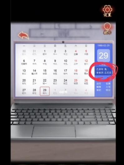 接电话后通过剧情,柜子上日历点击得知墨雨过农历生日,2012年3月21日(二月初八)对应19880208打开电脑得知八字“乙卯年、辛未月、乙巳日”