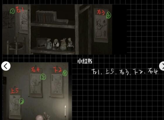 左下箭头,床下抽屉老钥匙打开得到【人形小木人】放到右侧箭头房门右侧墙上图案中央,根据壁画手臂所指方向和数字,按照年龄顺序从小到大排列如图为“左1上5右3下2右4”移动小木人,出门通过剧情(感觉司机是个木偶)
