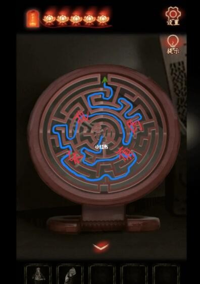 床头得到【鸡头人偶】床头柜下层得到【猴头人偶】桌上画册最后一页得到【窗花】对床头柜上胶水使用得到【有点粘的窗花】贴到镜子上,根据迷宫路线顺序如图得知“南东北西”打开抽屉得到【龙头人偶】【短磁铁】