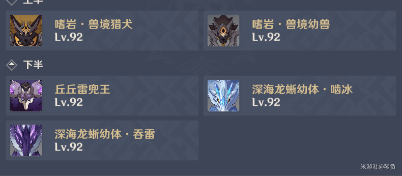 (1)上半:兽境猎犬——岩,对于普通操作的玩家需要奶妈,利好岩系角色。优先刷新幼兽,最后刷新大兽。