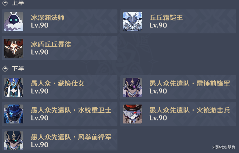(2)下半:愚人众套餐组合(无冰胖,冰莹,雷莹),需要聚怪角色,利好永冻阵容。优先刷新其他四只愚人众,最后刷新镜女。