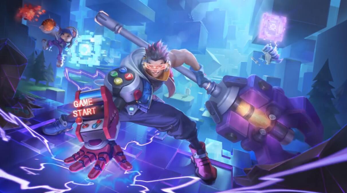 在这个世界里,狂铁的手臂化为了游戏手柄,并拥有一柄巨大的武器。人物整体颜色搭配以红蓝为主,以对应和强化电子竞技的感受,配合街机、游戏手柄等元素,突显狂铁作为游戏高手的身份。