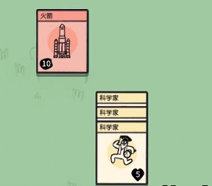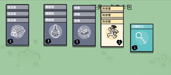 4、燃烧剂*3、钛合金*3、铁棒*3、万有引力、科学教*3,这些卡牌叠合在一起,合成一支大火箭。