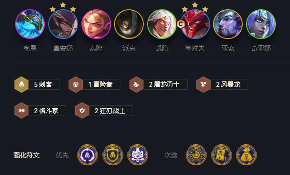 棋子:奥恩+黛安娜+泰隆+派克+凯隐+奥拉夫+亚索+奇亚娜