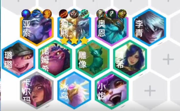 棋子:卡尔玛+小炮+艾希+璐璐+凤凰+盲僧+狗熊+奥恩+亚索