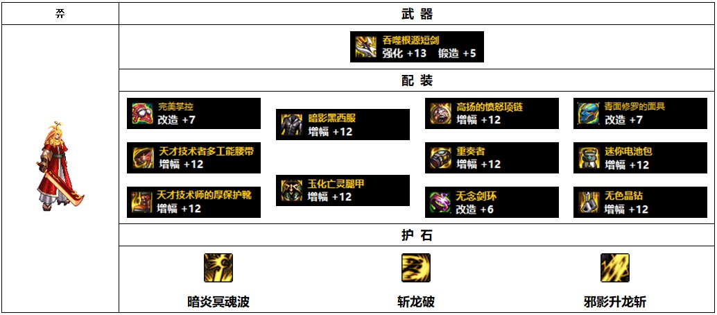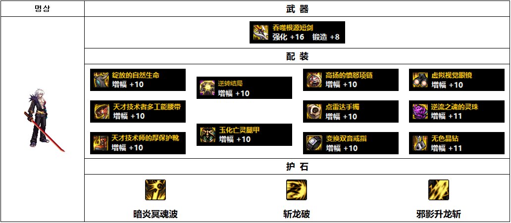 吞噬根源短剑、完美掌控、黑西服、愤怒项链、修罗面具、天才技术师腰鞋、亡灵腿甲、重奏者、无念剑环、迷你电池包、无色晶钻