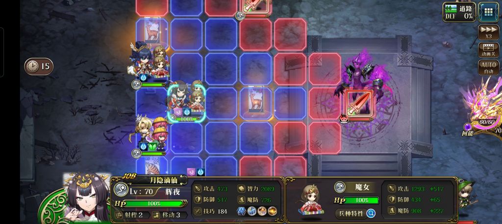 第三关,应该是最简单的一关了,但要注意,你的长手法师们,至少应该可以在卢克3c打过boss后,可以抗住boss aoe,开局辉夜罗杰利亚纳左边,卢克舞女右边