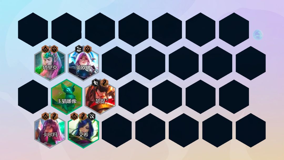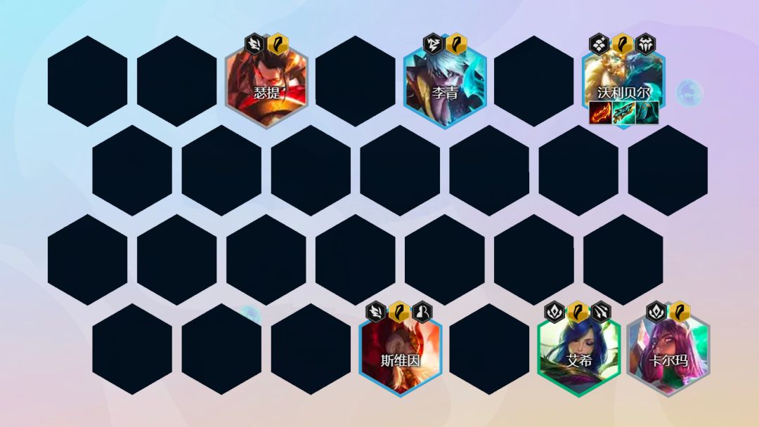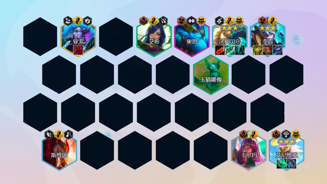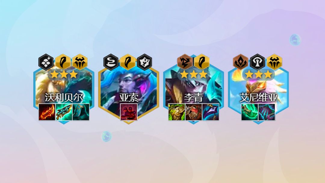 阵容组成:艾希、沃利贝尔、艾尼维亚、斯维因、李青、奥恩、亚索、妮蔻/卡尔玛(有神龙纹章换妮蔻)