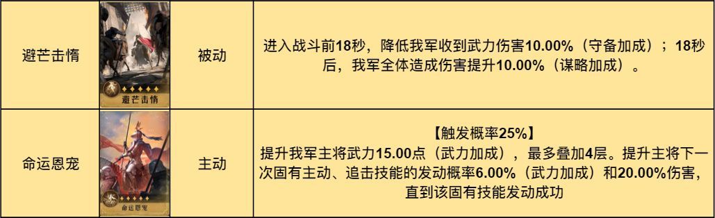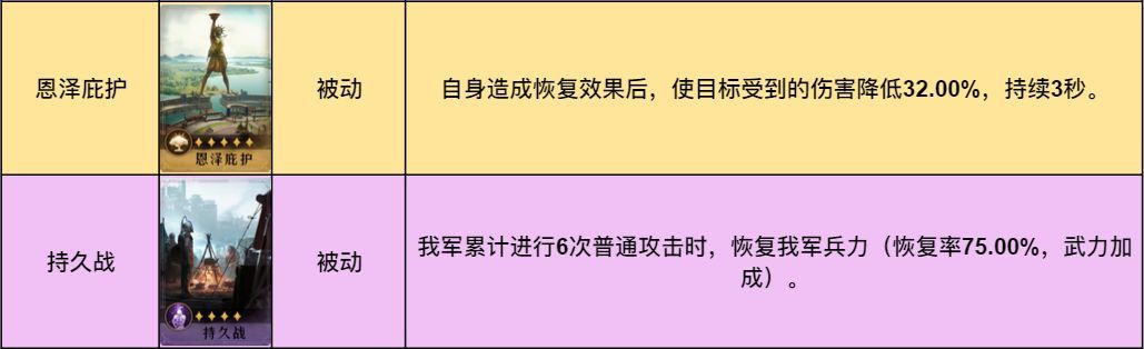 固有技能无上军心具有回复效果,此外还有概率附加1秒的抵御(无敌)状态,因其CD仅6秒,可搭配恩泽庇护增强队伍抗性。