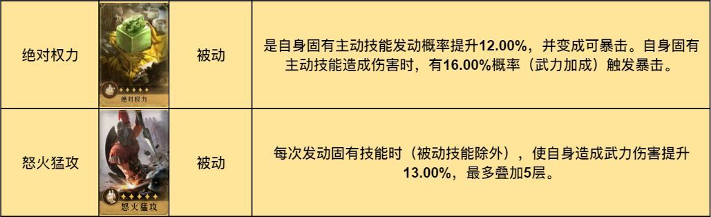 固有技能天下归心可使主将立即释放一次固有主动技能,并且提升该技能伤害。