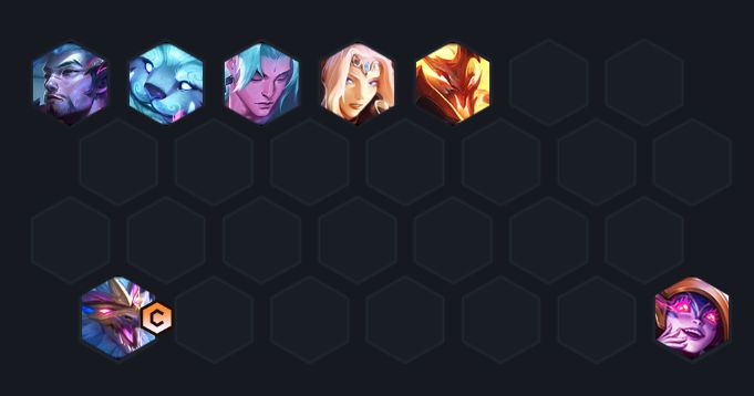 3-2拉6人口,一般都不需要D牌,埋头速7再搜牌比较好,如果前期牌很烂走了连败,那就在6级小搜,为永恩或者EZ追出两星,再补充下前排质量,应该就能稳血上7。一般情况下在3-5或者4-1拉到7人口,开始大搜,最为关键的目标就是找到一张迭嘉,然后场上开出6幻镜,多余的人口全挂重骑,场上低费卡都到两星的话基本就能锁血上8了。