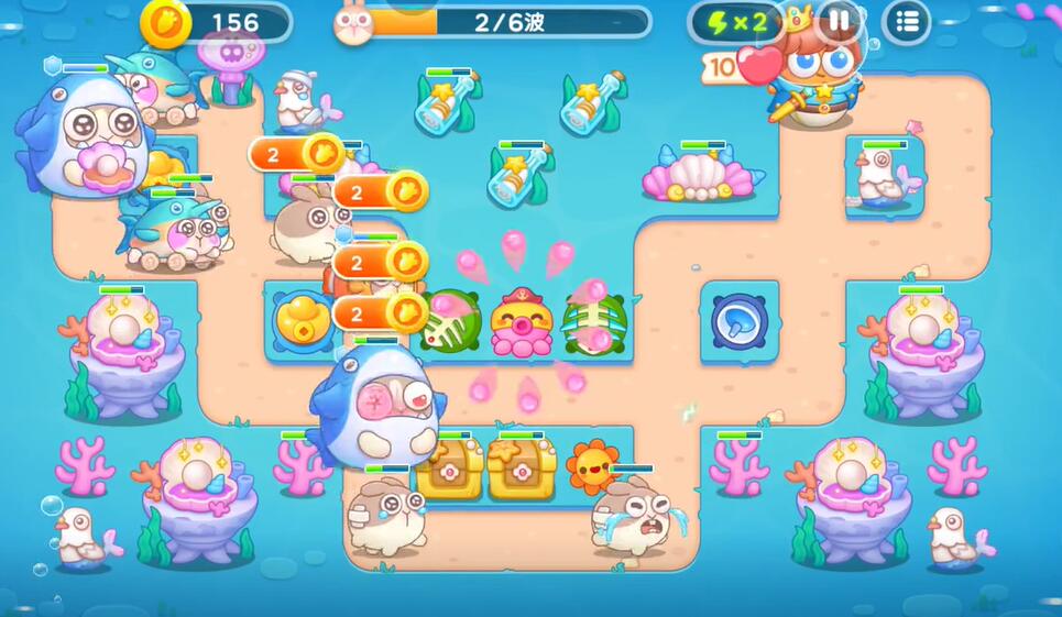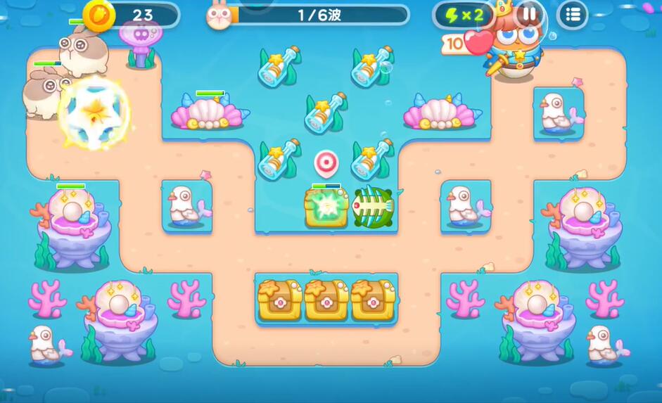 1、在中间的宝箱右侧建造一个鱼骨塔对宝箱进行攻击,利用关卡提供的左上角的元宝塔清理兔子。